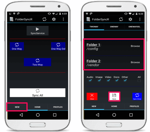 It’s pretty easy to get started with the app to sync folders. Just download and install on your phone and launch it. Next, tap on the New button from the bottom left position and start creating your profiles in it. There are three sections available in the app to create a sync profile. The sections are TWOWAY, ONEWAY, and ONEWAYDEL respectively. After that, depending on what kind of sync you want, select that section and specify the folders, one from internal memory and one from SD card. Now, specify the type of files that you want to sync and then finally hit the Save button. You can also specify the sync time interval. After all set, hit the save button and from now on the specified folder on phone will remain in sync with folder on SD card.