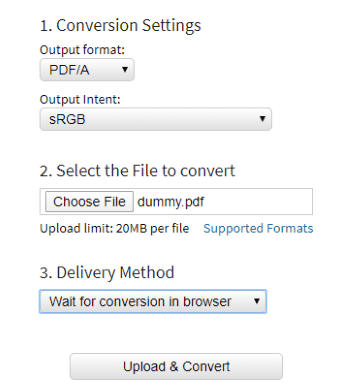 At this point, you can select the output format as PDF/A. Then, you can select the output intent, for example, sRGB, SWOP, GREY, etc. Now, you can upload your PDF file in order to convert it to PDF/A. You can upload the file with a size of 20 MB.