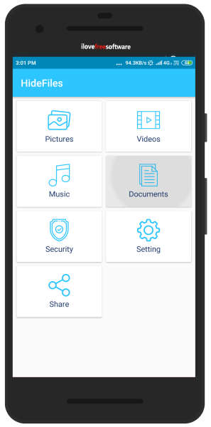 On the homepage, you can see the sections to hide files. The app lets you hide pictures, videos, music, and documents. It is quite simple to hide your documents just by selecting PDF, DOC, XLS, etc., available on your phone.
