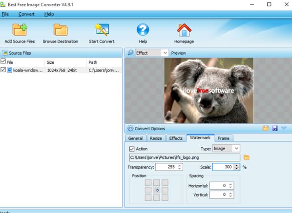 Best Free Image Converter is an image converter with additional features, features like watermarking. Interface is standard, with a toolbar at the top, right sidebar lets you tweak conversion options, while the rest of the interface holds the list of images for processing (yes, batch processing is supported).