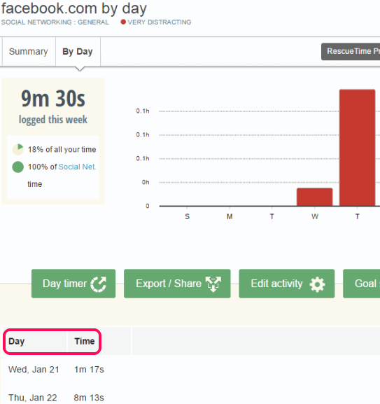 RescueTime (Lite version) is another handy time tracking software in this list. It works in the similar manner that above-mentioned software works. It doesn’t require any plugin and it works for all browsers. It counts the time only when you are focused on Facebook. Timer will stop automatically when you will switch to other tab or log out from Facebook. This software also provides a graph to check the summary for every day of the week.