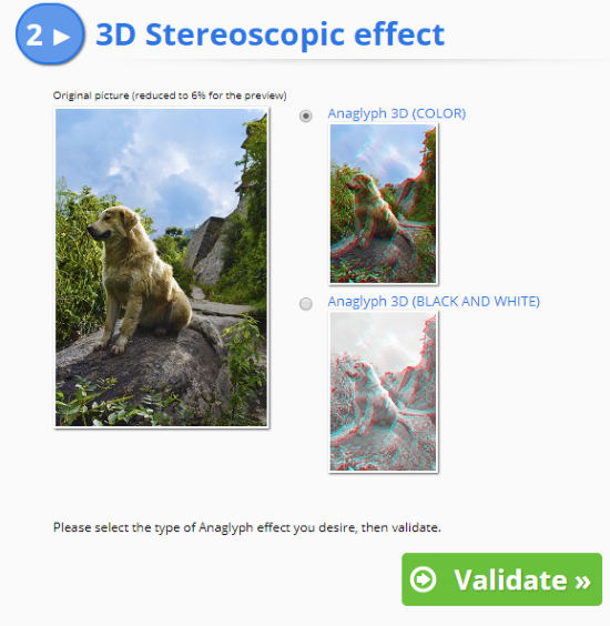 As shown above, you will get two anaglyph outputs, color and black & white. Select the one you want to download and click on Validate option to download the photo with anaglyph effect.