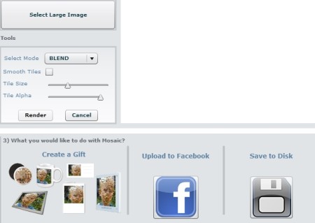 The final platform to a create photo mosaic with Facebook images is Build A Mosaic. Although the interface of the website is not that pretty, it has got a decent set of tools that let you create & share photo mosaics on online platforms like Facebook, or save them on your local disk. You can start creating a mosaic without signing up for any account. The above link will take you to the page where you can start creating your mosaics either by uploading images from your system or by choosing images from your Facebook account. Options like tile size, image mode, smooth tiles are all available and you can share your mosaics once it is ready. There is also an option to gift your mosaic to someone by printing it, which will require you to loosen up your pocket a bit.