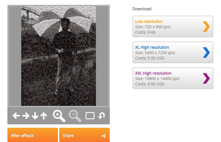 Another promising platform to create photo mosaic is EazyMoza. You can simply start creating your free photo mosaics and keep them in your account ( for maximum 14 days). However, if you want to save your created mosaics across devices, you need to create a free account. Every time you wish to create a new mosaic, hit the given option in your account and go through the simple process. The first step requires you to connect with your Facebook account and select a main image for your mosaic. After that, you can upload multiple small images for your mosaic; the website recommends selecting up to 100 images per mosaic, and does not allow more than 250 images per selection. What really impresses about the website are its editing features. There are pre & post mosaic effects available that you can use like adjust number of cells, image size, tilt image, adjust brightness, saturation, color scheme, and much more. Finally, your photo mosaic is available for free download in low resolution & can also be shared on Facebook and other sites. Hit the link above to try it out.