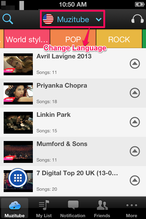 You can download the MuziTube 2 app from the App Store or by clicking on the link given at the end of this review. You need to sign up with the app first before you can either start using it. You can integrate the Facebook account with it. The app is set to Global category by default. You can change the preference if you want, by tapping on the icon at top of the window. The app displays the songs based on this preference only. The available preferences are: Global, Korean, Taiwan, Hong Kong, and India.