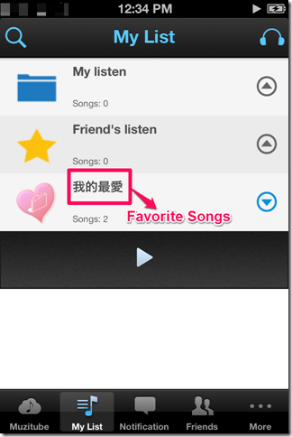 The app lets you check the songs listened by you and your friends earlier. Tap on the tab My List to access these options. You will see 3 options in the new window: My Listen, Friend’s Listen, and Your Favorite Songs.