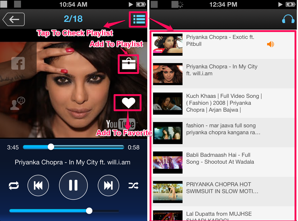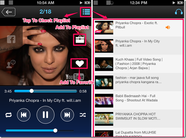 Tap on your favorite genre and then on the song which you want to hear. The songs will start playing but the streaming speed will depend on your internet connection. You can also add the song to your favorite list. Tap on the heart icon to save it to the favorite list. While listening to song, you can also check the whole playlist. Tap on the three bar icon at top right corner to go to the playlist.