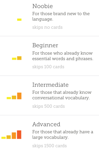 On launching the app, you have to select your level of proficiency in Spanish first. You can choose from: Noobie, Beginner, Intermediate, and Advanced. The app displays flashcards to you on the basis of proficiency level selected by you.