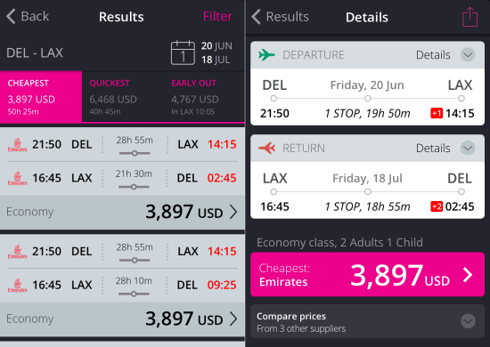 Momondo is a free iPhone app to compare and find cheap flights which you can filter on the basis of various criteria. The app has very attractive and fluidic interface which makes it easier for you to navigate through the app. The feature which sets Momondo apart from other travel or flight finding apps is the options which it provides for searching the flights. Apart from the traditional features like providing the departure/arrival city, number of passengers etc., you can search the flights on the basis of Ticket type, Cheapest flights, Quickest Flights, and the Early Out flights. The Early Out flights means that the flights which are going to depart within just next 1-2 hours. You can even filter flights on the basis of specific airlines like United Airlines, British Airways, Fly Emirates, KLM, Air France, and much more.