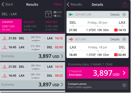 On the next screen, the app will display all the available flights divided across following 3 categories: Cheapest, Quickest, and Early Out. Tap on any flights name to know the details about it like complete route of flight, number of stoppages, time for reaching the destination, and compare prices. If you want to save/share the flight details then you can do so by tapping on the icon at top right. When you want to book any flight, just go to that flight and tap on the ticket price to book the flight. Do remember that app redirects you to browser for making the booking. There is no option for booking flights from within the app.
