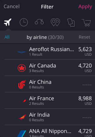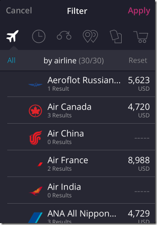 The app also lets you filter the search results on the basis of following criteria: By Airlines, By Time, By Stops, By Airport, By Ticket Type, and By Travel Site.