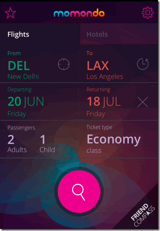 You don’t need to have any account with Momondo app for searching and comparing flights. Simply launch the app and you are all set to start the search process. You will see the home screen of the app as shown in screenshot below. Here you can see that there are following fields: From, To, Departing Date, Returning Date, Passengers (Adult/Children), and Ticket type. Just enter the details and tap on the search icon to get the flights matching the data entered by you. While entering the From location, you can also use GPS to enter your location if you don’t want to enter it manually.