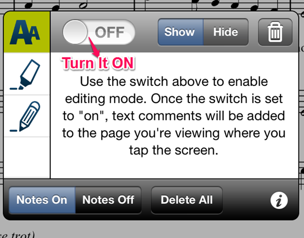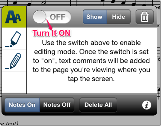 You can use pinch and zoom feature to zoom-in and zoom-out of the music sheet. If you want to turn pages then swipe left or right. You can also add your own comments and makes notes on the sheet from within the app. Tap on the Menu button at the bottom of the screen and turn it ON to get editing tools.