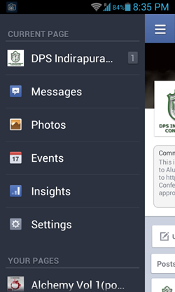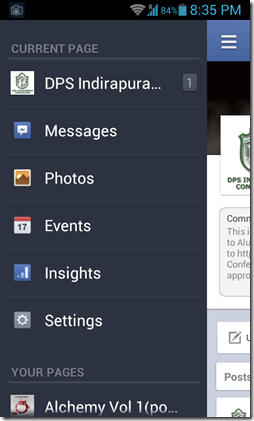 In the above screenshot, there are also options like Posts by others (allows you to see posts by other people), Update Status (allows you to update the status of your page), Share photo (allows you to share images to your page via your Android device directly, etc.) - When you open the pages menu as shown in the above screenshot (by clicking the button at the top-left), you will see a menu that looks like following screenshot.