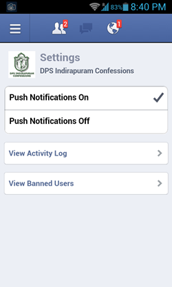 Here, you can see some pretty much self-explanatory options like Messages (shows you the messages that users have sent to you), Photos (shows you the images that you have uploaded), Events (Events that you have created/other users have tagged your page in), Insights (shows you the Insights on your page), Settings (allows you to control the various settings of Pages Manager). You can scroll down in this menu to see your other pages and select them to view those pages as well. At the bottom you also get options to log out from Pages Manager, etc.. - In the Settings menu, you can access a few options like turning Push notifications on/off, viewing banned users and unbanning them, or viewing your Activity log. (see screenshot below.)