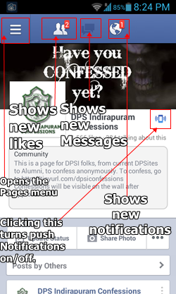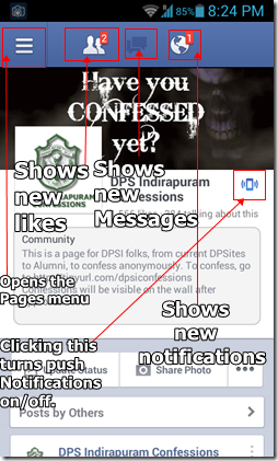 As you can see in the above screenshot, I was already logged in through my account, so when I ran the Pages manager, I can easily click on the Continue as….. button to manage the pages that I have created from my id. If in case, I have to manage the pages that I have created through some other id, I can click on the “Not You?” text, which then will prompt me to enter the user id and password of the account that I wish to access the pages for. - When I clicked continue as button on the login page, I was presented with the following screen, where I was automatically taken to the page for which I had the maximum likes and notifications at that time. If you are already using the Facebook for Android app, you will be quite familiar with the interface that you would see. You can see your page’s cover pic and profile pic at the top (below the topmost bar where you can see the new likes, messages and notifications). See the Screenshot below to know how this screen looks like.