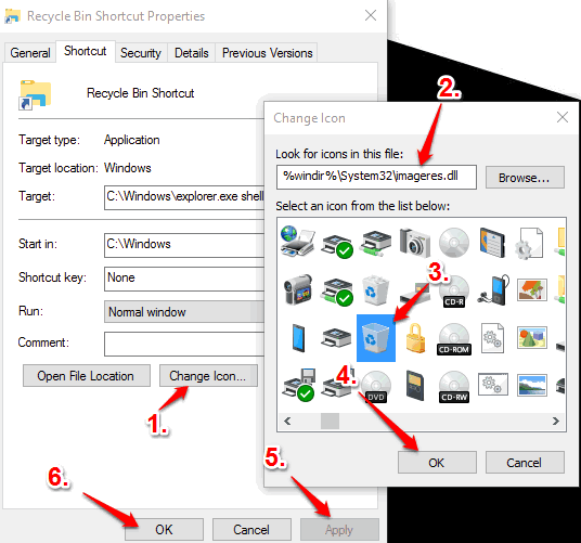 Step 4: Recycle Bin shortcut will be created. Now we need to change its icon so that we can add Recycle Bin icon for this shortcut. So access the Properties box of this shortcut and then click on the Change Icon.. button available in the Shortcut tab. It will open a small window. In that window, you need to paste this text “%windir%\System32\imageres.dll” and press the Enter key. This will show the list of icons.