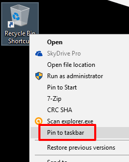 Step 5: Now the shortcut will have Recycle Bin icon. It’s the time to add it to taskbar. Right-click Recycle Bin shortcut and click the Pin to taskbar option.