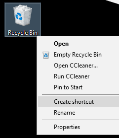 Step 1: Right-click on Recycle Bin icon available on the desktop and click Create shortcut option. If Recycle Bin icon is not available, then you first need to add Recycle Bin to desktop.