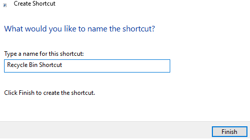 Step 3: This a very simple step. You need to give a name to the shortcut that you are going to create. Give it Recycle Bin shortcut or some other name and complete the wizard.