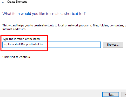 Step 2: In that wizard, you need to paste “explorer shell:RecycleBinFolder” in the available box. See the screenshot below.