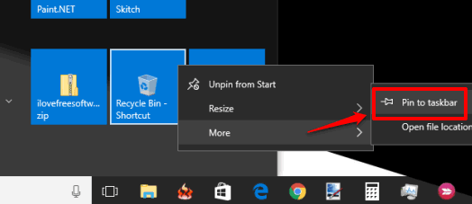 Step 3: Open Windows 10 Start menu and you will see Recycle Bin shortcut tile. Right-click on that tile→ More→ Pin to taskbar.