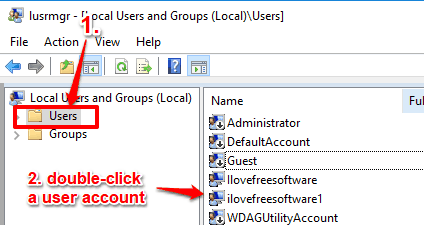 Step 2: When Local Users and Groups window is launched, click “Users” folder. This will show all the user accounts available in your Windows 10 PC. Now double-click on the user account for which you want to disable password change.