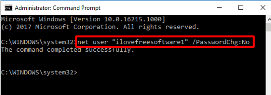Step 2: When Command Prompt window is launched as administrator, type this command: “net user “user account name” /PasswordChg:No“. Here, replace “user account name” with the actual user account name. Press Enter to execute the command.