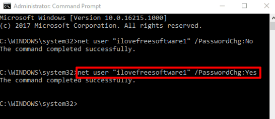 Step 3: To enable password change option for that user account, you have to execute the similar command as above. Just replace ‘No’ with ‘Yes’. Here is the command: “net user “user account name” /PasswordChg:Yes“.