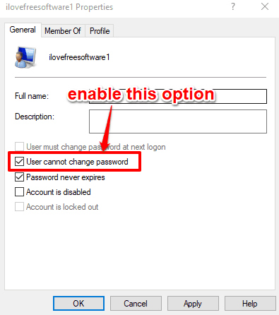 Step 3: Properties window of that particular user account will open. Here, you will see “User cannot change password” option. Enable it and then save this new setting.