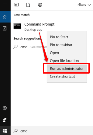 Step 1: Run Command Prompt window as administrative. For that, type cmd in Search box, right-click on Command Prompt option visible in results and click “Run as administrator” option.