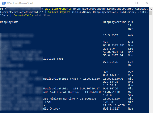 Get-ItemProperty HKLM:\Software\Wow6432Node\Microsoft\Windows\CurrentVersion\Uninstall\* | Select-Object DisplayName, DisplayVersion, Publisher, InstallDate | Format-Table –AutoSize