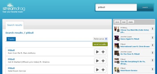 Last is Streamdrag, a simple service to create playlists from YouTube video clips and play them anytime. The service requires a small sign up before creating the playlists. Once you register, you can easily create playlists and share them online. The process involves searching tracks using a keyword, or directly through album or artist names. The results would be displayed with a Plus (+) sign to add selected tracks to the playlist. Once created, you can save playlist to your account and share it via a generated URL.
