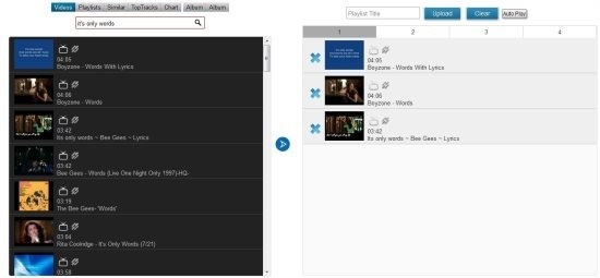 Jiggyape is an online service to create playlists of YouTube music tracks and share them via a playlist ID. The service does’t require any account creation and lets you easily create playlists of your favorite music videos. The process of creating playlist is similar to the one discussed for Youtube Playlist Maker. Jiggyape also comes with an integrated music player, so that you can watch YouTube videos right within the app. Plus it has a library feature that lets you sync your own music (imported from hard drive) with that of the Jiggyape. The interesting thing is that you can sync not only videos, but audio also. In case you sync audio, Jiggyape automatically looks for its video on YouTube and play it for you. The only feature missing is, it doesn’t support exporting playlists on YouTube.