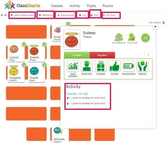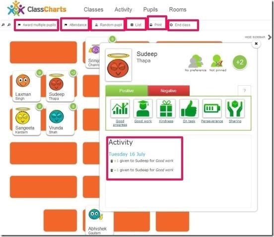 Class Charts is another feature rich free online student management tool that lets you create seating charts so as to manage student’s behavior in a better manner. This free online student management tool lets you keep track of attendance to mark each students presence in the classroom. It has the ability to add respective photos of the students so as to manage the seating arrangements accordingly. This free online student management tool provides you behavior summary of all students, so as to notice the improvement or decline in student’s behavior. It also lets you mark improvements from the positive and negative options and allows you to add award points of each student. The Random pupil options lets you make a note of correctly answered queries and figure out which student is working hard. The best feature of this free online student management tool is that it lets you invite collaborators which can be colleagues and parents, so as to tackle students behavior in a team. Not only that, it generates detailed class reports as graphs that provide you details related to students behavior growth, behavior score breakdown, track activities & assessment points, and attendance. Chrome users can avail Class Charts either from the Chrome WebStore or from here.