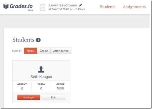 Grades.io is a free online student management tool that lets you keep track on students performance right away from your web browser. This free student manager’s free version allows you to manage single classroom of unlimited students. It facilitates you to create multiple assignments without any restriction, and lets you manage all without any fluff. This free online student management lets you take attendance, grade students using points or percentage so as to track their progress in terms of studies and activities. This service allows you to send messages to the entire class regarding new updates, exams, assignments, etc. and at the same time allows you to send messages individually to particular students. Overall this is a feature rich free online student management tool to manage a single class with great ease. To manage multiple classes via this app, you’ll have to upgrade your account to the paid version.