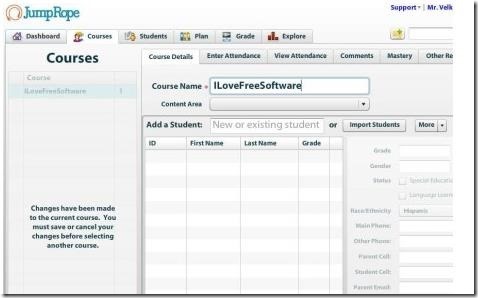 JumpRope is a free online student management tool that allows teachers to track students progress so as to manage students in a better way. This free online student management service lets you create courses, create lectures, curriculums, students lists, etc. allowing you to keep track of grades so as to keep an eye on students academic progress. It also allows you to keep track of number of students attending class and therefore allows attendance tracking. This free online student management tool has the ability to track students behavior as it provides you various categories so that you can categorize each of them, and remain up to date. This free service lets you create quick checklists and provides you the facility to add comments against each student for quick overview and regular observation.