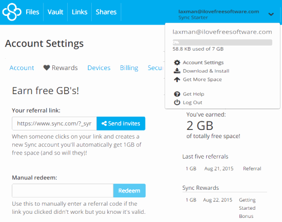 It provides 5 GB free storage space and you can also earn 1 GB extra space by completing the additional tasks. Moreover, when someone signs up to this website by using your referral link, you and that particular user will receive 1 GB additional space. So there’s a good chance to grow your free storage space.