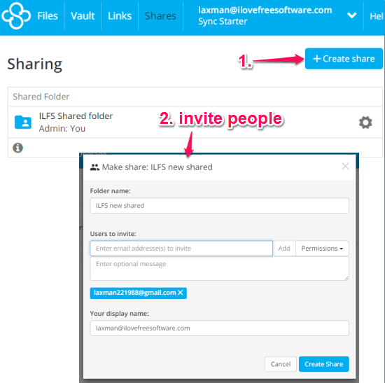 Use Create share button to generate a shared folder and invite your friends by sending them an email. When they will create the account and join the shared folder, they will be able to see the folder content and manage the files.