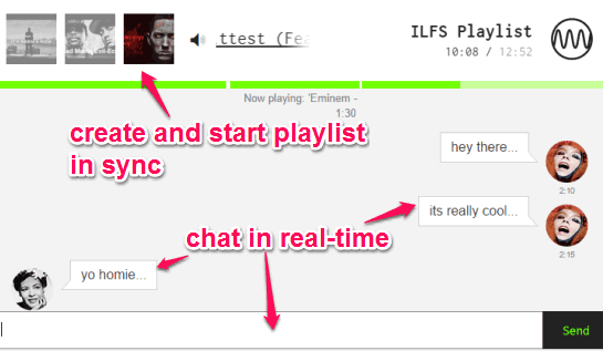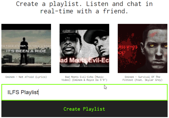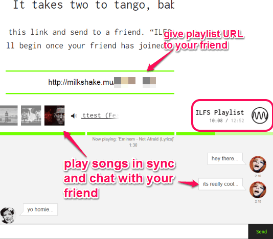 Milkshake is an interesting website that helps to create online music playlist and share with a friend. Then, two of you will be able to listen to the playlist together. Not only this, you can chat with your friend in real-time.