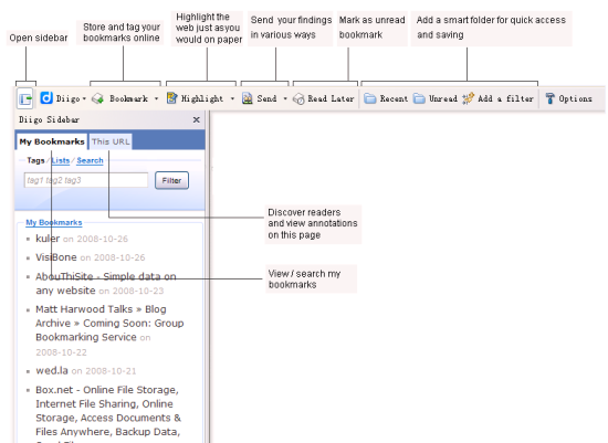 All you need is to install the Diigo browser add-on with Bookmark, Highlight, Capture and Read Later buttons. The screenshot below will let you gain a better understanding about Diigo toolbar.