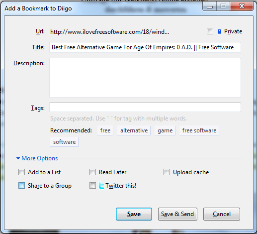 - Next, provide description and tags to the link as applicable. You may check the checkboxes in lower section of interface to add link to a custom list, reading it later, uploading cached version, sharing to a group, or for sharing on twitter. If the list does not exists; Diigo will create a new one.