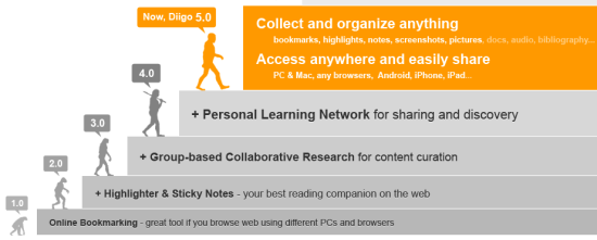 Diigo is an online bookmarking tool cum personal information management system. It provides support for all major web browsers, iPad, Android, and iPhone to help you collect variety of information from the web. Any item that you add to Diigo online bookmarking platform goes to your Library and can be accessed from anywhere.