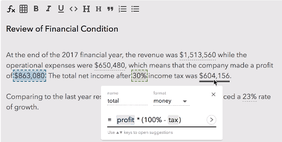 In this way, you can use this tool to add calculations directly in text. And you can do almost anything related to calculations which involve money, numbers, and percentage. This tool lets you do that in a very efficient manner.
