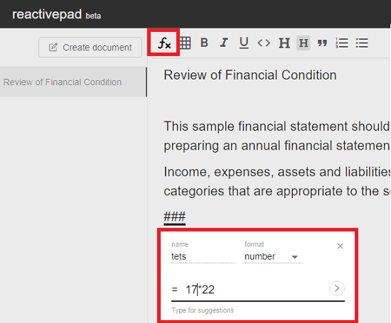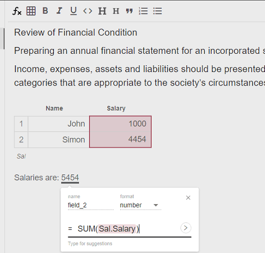 Step 2: You can keep writing the report in flow and when you need to add some calculation, simply add it using the “fx” from the toolbar. After that, you can specify a name to it, its type, etc.