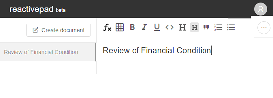 You just have to create an account on Reactivepad and then start using it. There are various tools in it that you can use to create your report. Also, the workspace that it offers is very simple like some distraction free writers. You can create any report here which requires some calculations for parameters like tax, profit, total revenue, expenses, etc. You can also show your data in the form of tables and manipulate that with the help of formulas. It supports all the Excel formulas to manipulate the tabular data.