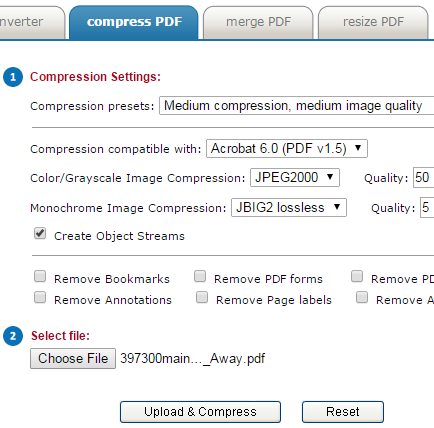 Neevia Online PDFcompress is the last website in this list that provides high, low, maximum, and medium level compression options. Selecting any of these options will affect image quality according to the associated compression level. You can also select options to remove bookmarks from PDF, page levels, annotations, etc. to adjust the compression. Unfortunately, you can upload only 5 MB size PDF file. Still it is a good website to compress PDF file with different options.