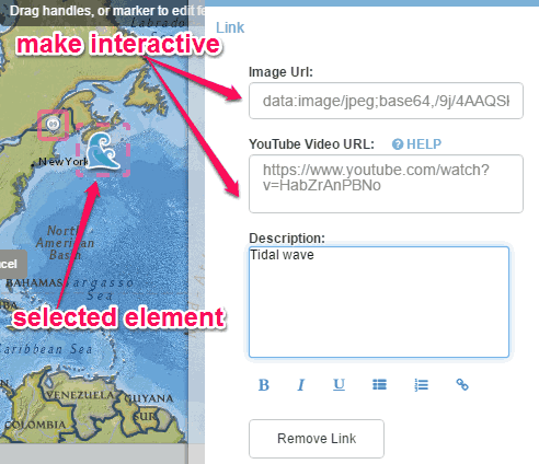 Step 4: Now, simply click on the “Link” option and you’ll be able to add a description, image URL, and YouTube video URL to make that particular element interactive. After that, each time you click on the element, a popup will appear with the image and video play button, as shown in the very first screenshot.