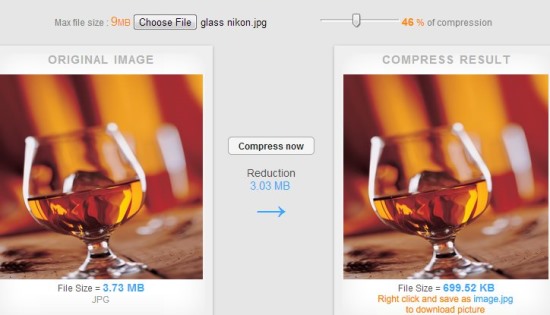 You can also reduce size of images and can use compressed images. Simply use Choose file tab and select an image from your PC and upload it to its interface. Here are few shortcomings with this online image compressor. Such as you cannot drag n drop image directly neither you can upload more than one image at a time. So upload an image and then hit Compress now button. Immediately image will be compressed and you can preview and can compare original and output image.