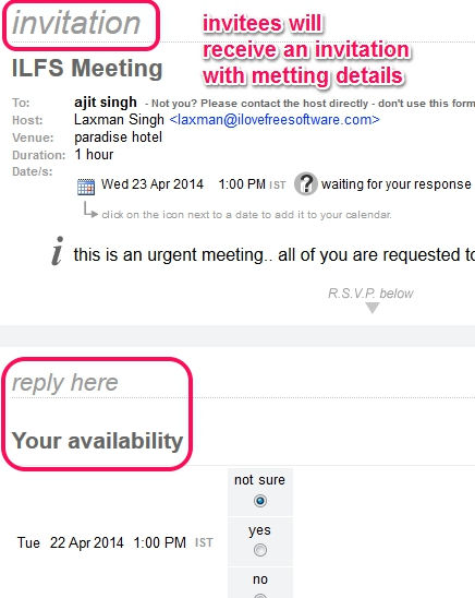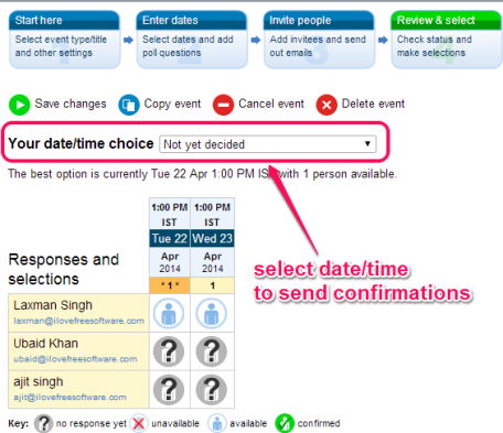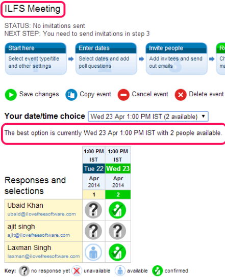 agreeAdate is a free service that is used as an online meeting scheduler, conference call scheduler, appointment organizer, as well as helps to arrange other events. It lets you choose a date, day, and time for a meeting, and helps to invite people and find out if they will be available on that particular date or not. Based on polling done by invitees, you can find the most appropriate date and time to schedule meeting, appointment, or conference call, as highlighted in screenshot below.
